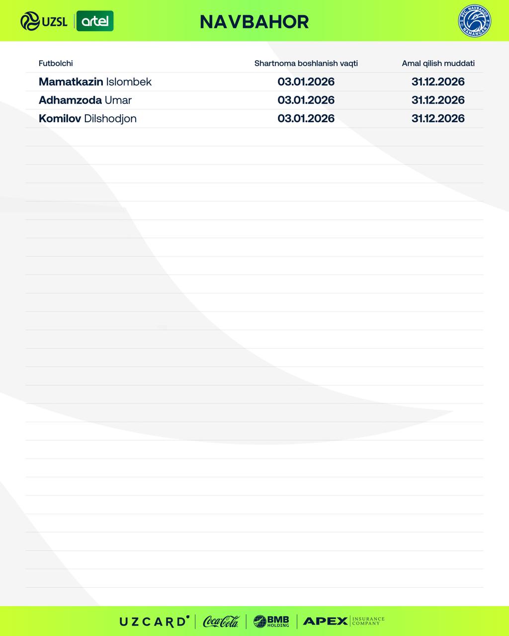 O‘zPFL xabariga ko‘ra, Namanganning "Navbahor" klubi limitdan tashqari 3 nafar futbolchini ro‘yxatdan o‘tkazgan.