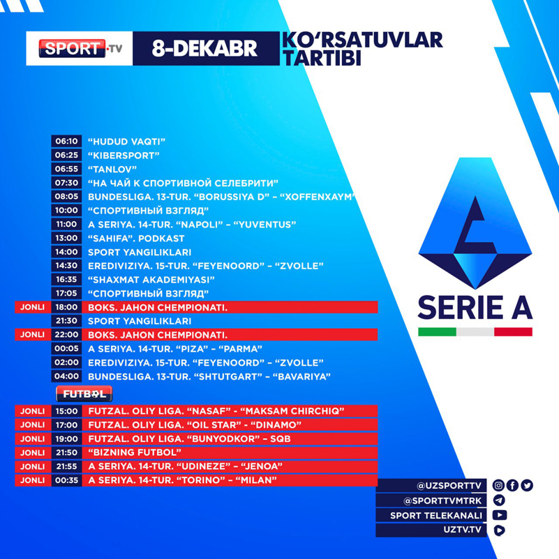Sport va Futbol telekanallari bugun — 2025 yil 8-dekabr, dushanba kuni quyidagi ko‘rsatuv va translyasiyalarni efirga uzatishni rejalashtirgan.