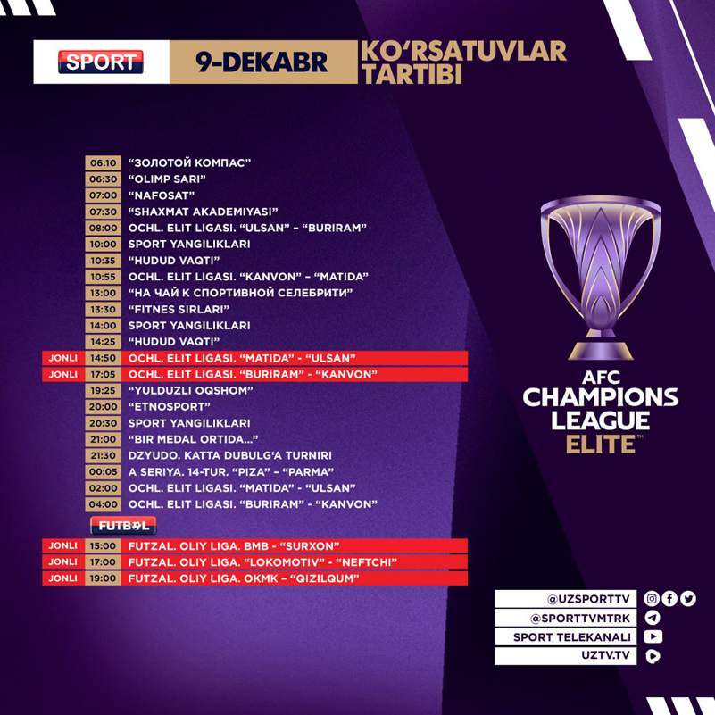Sport va Futbol telekanallari bugun — 2025 yil 9-dekabr, seshanba kuni quyidagi ko‘rsatuv va translyasiyalarni efirga uzatishni rejalashtirgan.