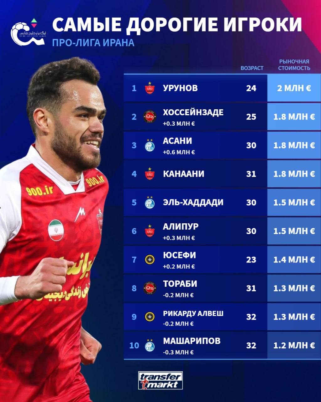 Unga ko‘ra, hozirda "Persepolis" safida to‘p tepayotgan o‘zbekistonlik vinger Oston O‘runov 2 million yevro narx bilan liganing eng qimmat o‘yinchisi bo‘lib turibdi.