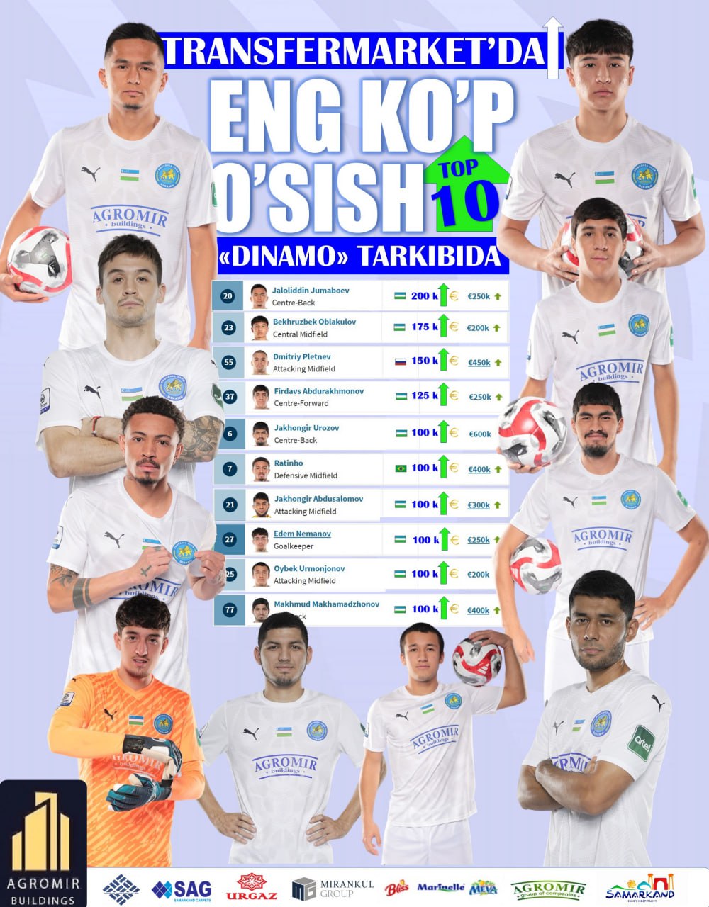 Quyida «Dinamo»ning transfer bahosi eng ko‘p oshgan o‘yinchilari top-10ligi bilan tanishing: