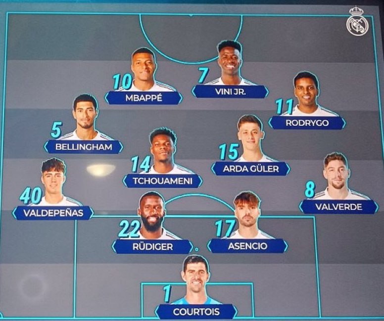 «Real»: Kurtua, Valdepenyas, Asensio, Ryudiger, Valverde, Tchuameni, Bellingem, Gyuler, Rodrigo, Vinisius, Mbappe.