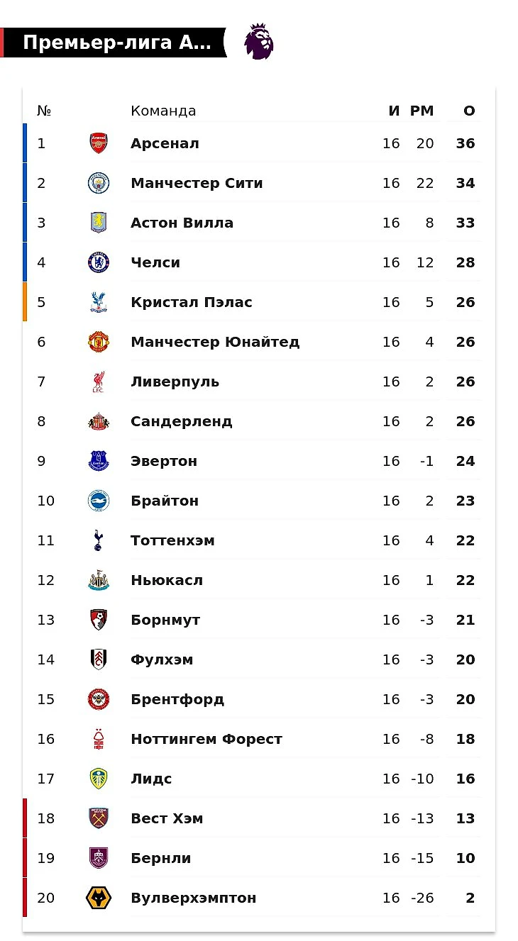 "Arsenal" ochkolarini 36 taga yetkazib, "Manchester Siti"dan 2 ochko, "Aston Villa"dan 3 ochko oldinda bormoqda.