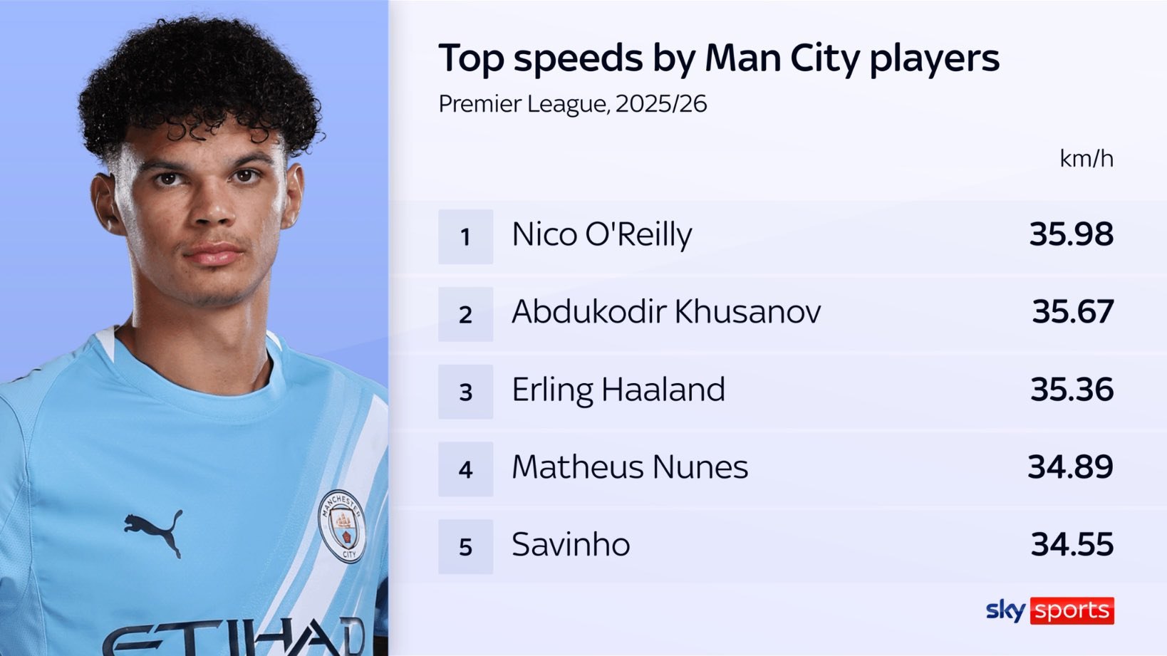 O‘zbekistonlik markaziy himoyachi Abduqodir Husanov "Manchester Siti"ning 2025/2026 yilgi mavsumdagi eng tezkor futbolchilari ro‘yxatida ikkinchi o‘rinni egallab turibdi. 21 yoshli futbolchimiz bu mavsumda 35.67 km/soat tezlikka chiqqan.