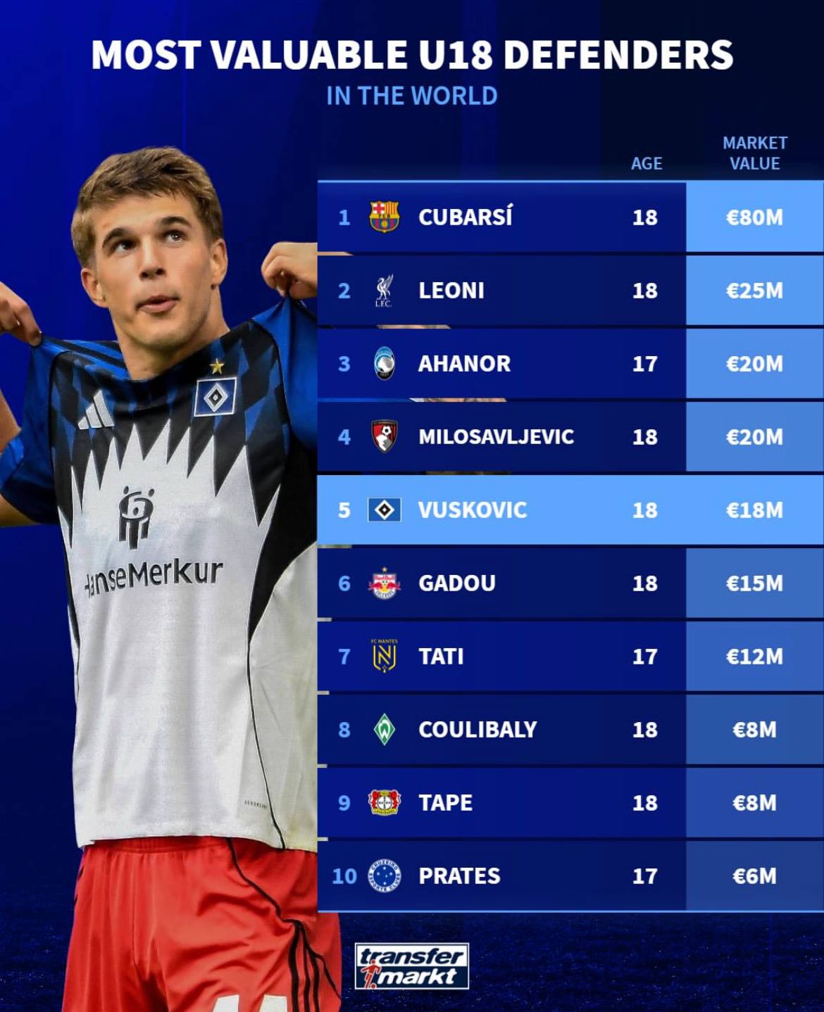 Transfermarkt internet-portali butun dunyo bo‘ylab 18 yoshdan o‘tmagan eng qimmat himoyachilar reytingini tuzib chiqdi.