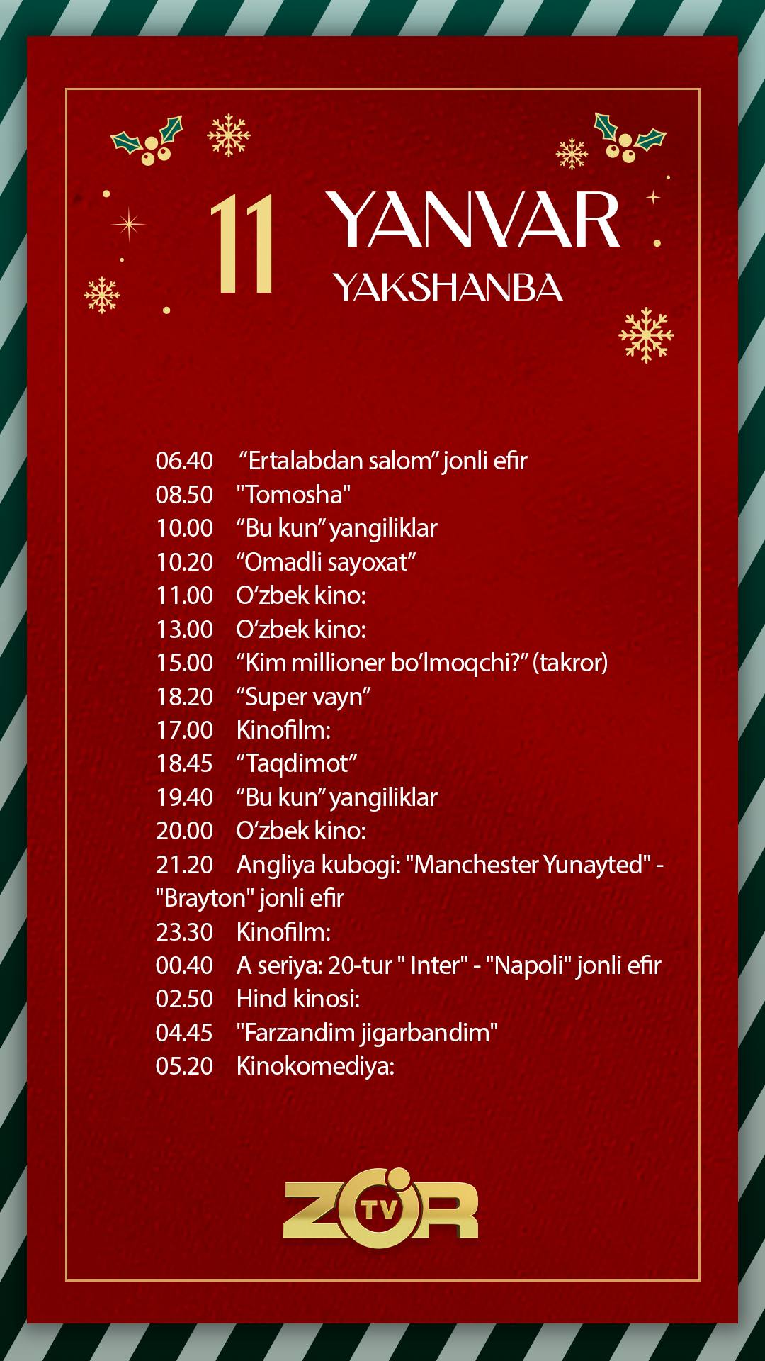 Zo'r TV telekanali bugun — 2026 yil 11-yanvar, yakshanba kuni quyidagi ko‘rsatuv va translyasiyalarni efirga uzatishni rejalashtirgan.