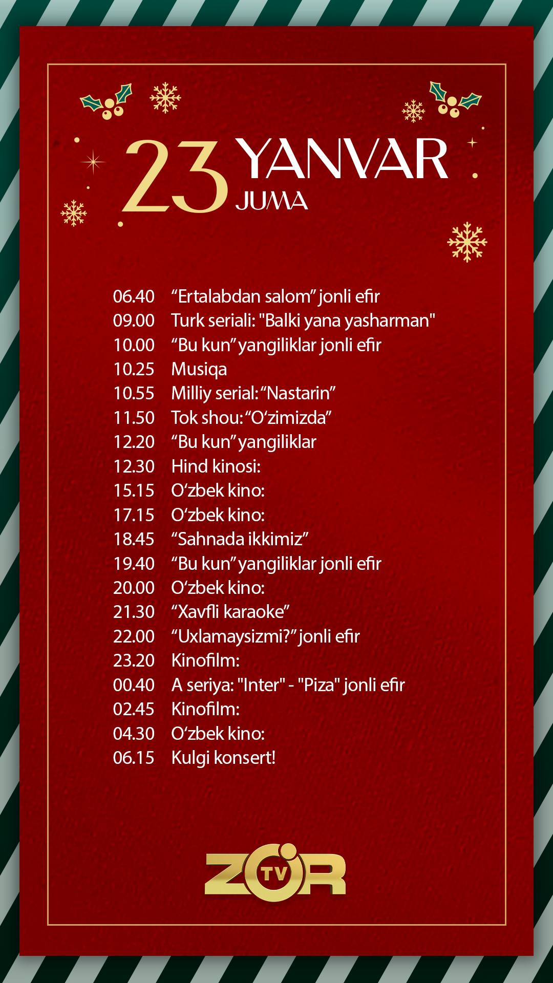 Zo'r TV telekanali bugun — 2026 yil 23-yanvar, juma kuni quyidagi ko‘rsatuv va translyasiyalarni efirga uzatishni rejalashtirgan.