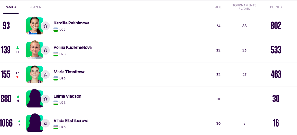 O‘zbekistonlik tennischilarning WTA reytingidagi o‘rni: