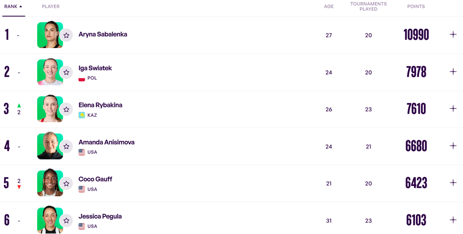 Xususan, 2026-yilgi Avstraliya ochiq chempionati g‘olibi Yelena Ribakina beshinchi pog‘onadan uchinchi o‘ringa ko‘tarilib, ikki yarim yildan so‘ng yana kuchli uchlikka qaytdi. U o‘z hisobiga 2000 ochko qo‘shib, amerikalik Koko Gauff bilan o‘rin almashdi.