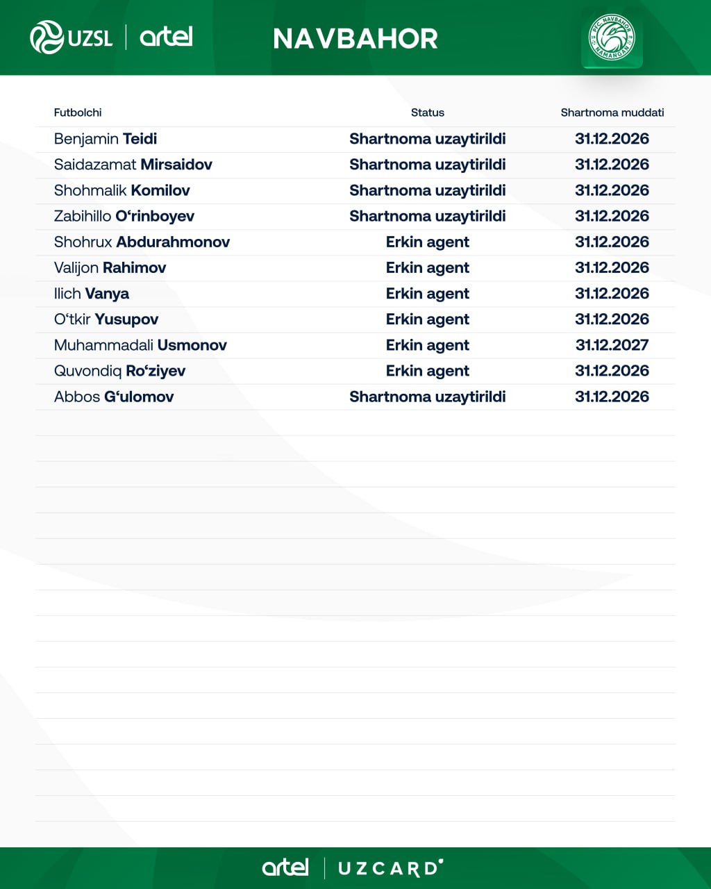 O‘zPFL xabariga ko‘ra, "lochinlar" ligada 11 nafar futbolchini ro‘yxatdan o‘tkazdi.