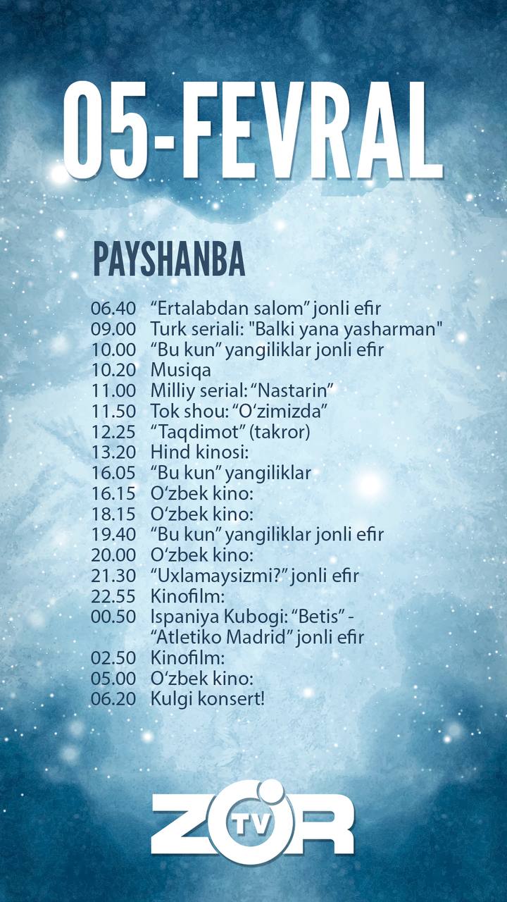 Zo'r TV telekanali bugun — 2026 yil 5-fevral, payshanba kuni quyidagi ko‘rsatuv va translyasiyalarni efirga uzatishni rejalashtirgan.