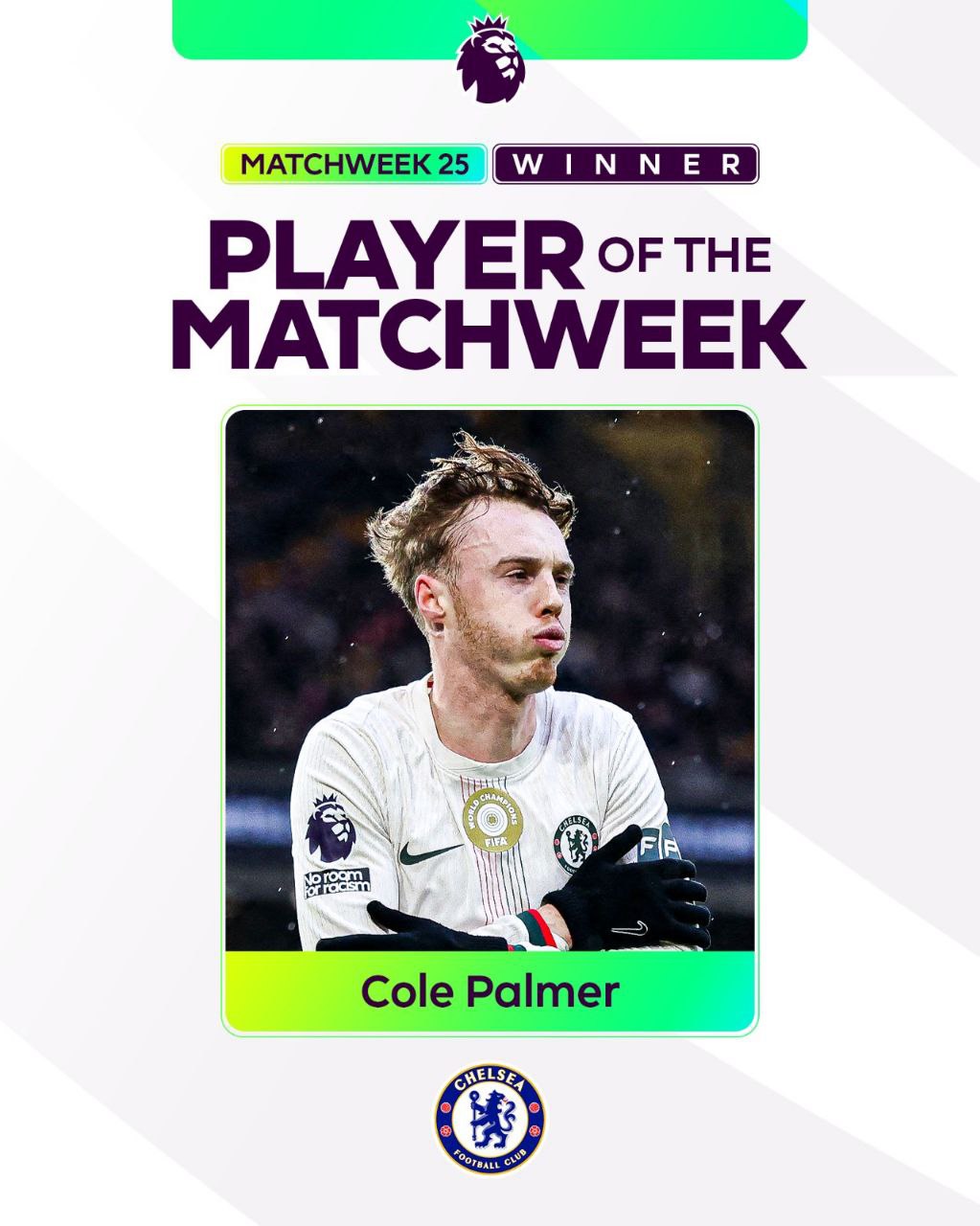"Chelsi" hujumkor yarim himoyachisi Koul Palmer Angliya Premyer-ligasida 25-turning eng yaxshi futbolchisi deb topildi.