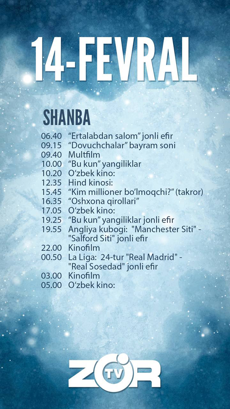 Zo'r TV telekanali bugun — 2026 yil 14-fevral, shanba kuni quyidagi ko‘rsatuv va translyasiyalarni efirga uzatishni rejalashtirgan.