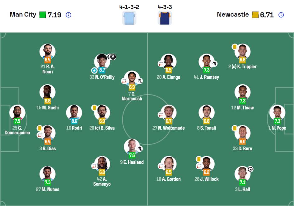 “Manchester Siti”ning har ikki goliga mualliflik qilgan Niko O’Rayli o‘yinning eng yaxshi futbolchisi deb topildi — 8,7 ball. Nikoning 14 hamda 27-daqiqalarda kiritgan gollari “shaharliklar”ga muhim 3 ochko taqidim etdi. Yarim himoyachi Rodri esa 8,6 ball bilan o‘yinning eng yaxshi ikkinchi futbolchisi bo‘ldi.
