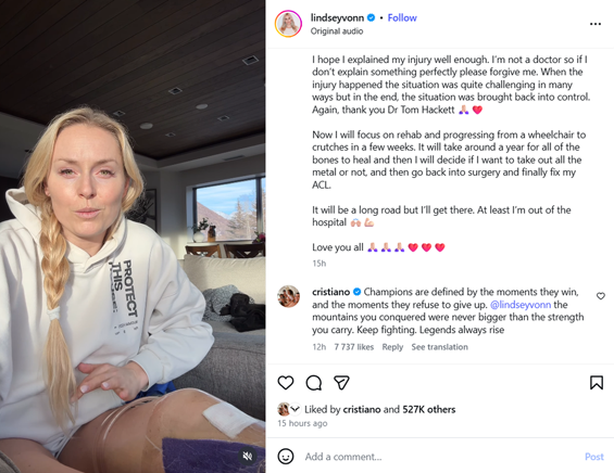 Futbol bo‘yicha besh karra “Oltin to‘p” sohibi Krishtianu Ronaldu 2026 yilgi qishki Olimpiya o‘yinlarida jiddiy jarohat olib, beshta operasiyani boshidan o‘tkazgan chang‘ichi Lindsi Vonni qo‘llab-quvvatladi. Portugaliyalik futbolchi amerikalik sportchining Instagram sahifasidagi postlaridan biri ostida izoh yozib qoldirgan.
