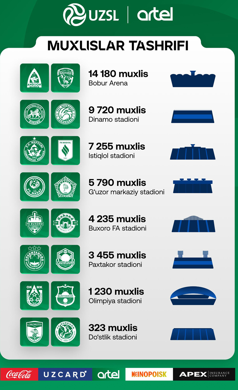 Eng ko‘p tomoshabin "Andijon" - "So‘g‘diyona" o‘yiniga kirgan — 14180 nafar. Bu borada ikkinchi pog‘onani "Dinamo" - "Navbahor" o‘yini egalladi (9729 muxlis).