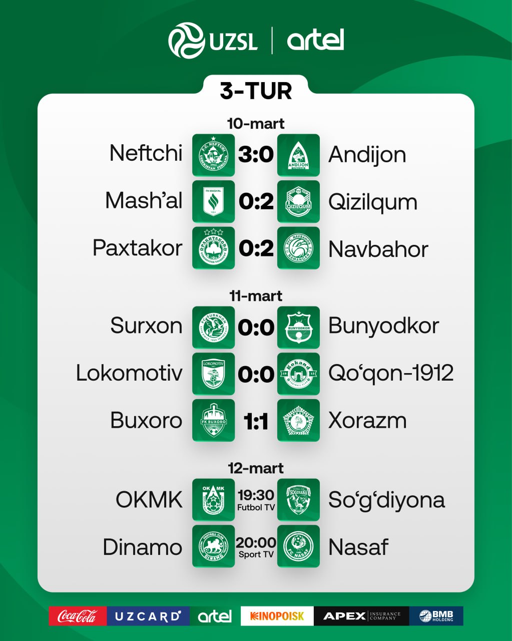 Superligada 3-turning navbatdagi 3 ta o‘yini o‘tkazildi.