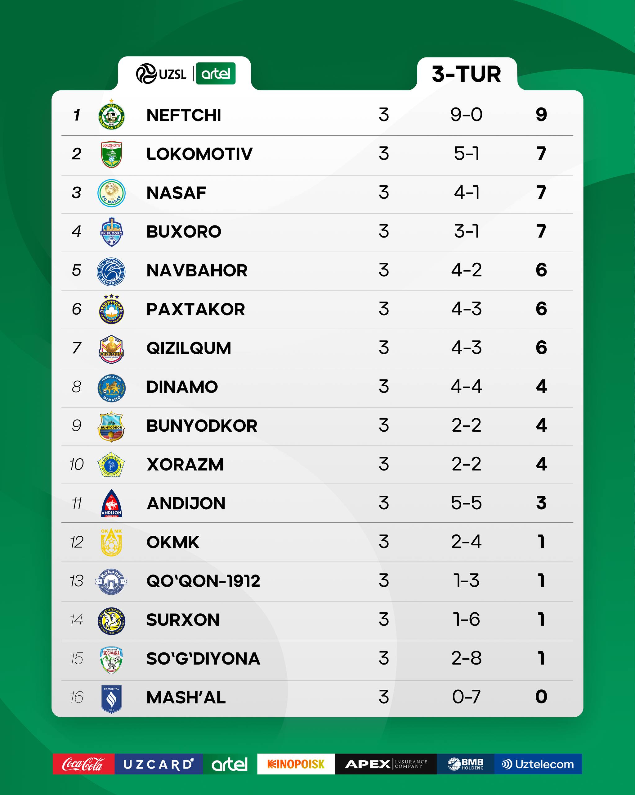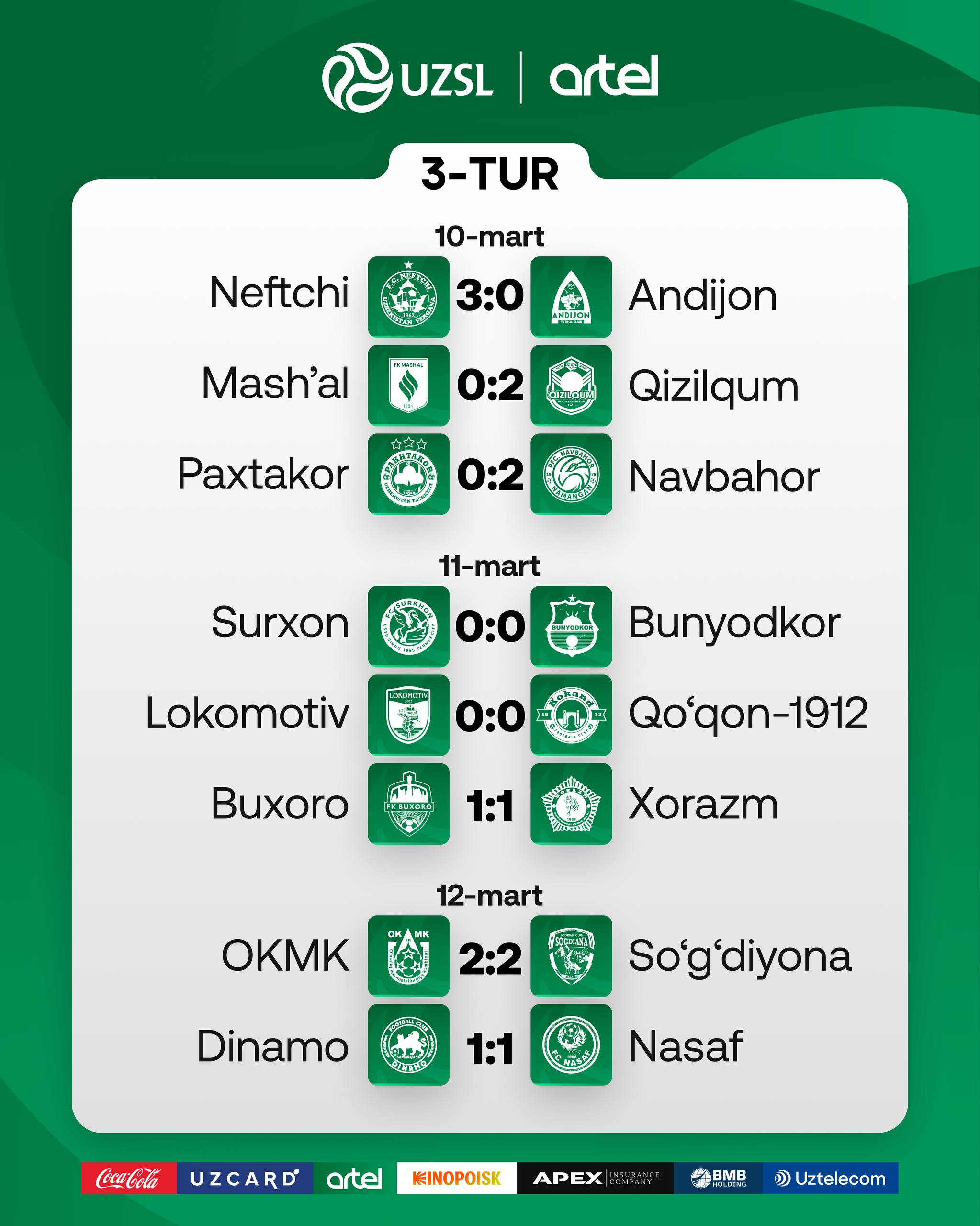 Superligada 3-tur o‘yinlari ortda qoldi.