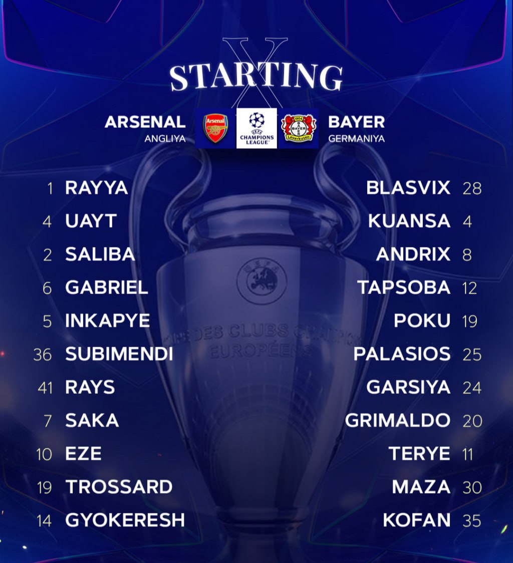 YECHL. "Arsenal" - "Bayer". Asosiy tarkiblar ma’lum