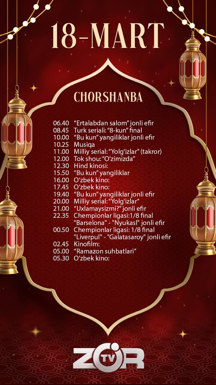 Zo'r TV telekanali bugun — 2026 yil 18-mart, chorshanba kuni quyidagi ko‘rsatuv va translyasiyalarni efirga uzatishni rejalashtirgan.