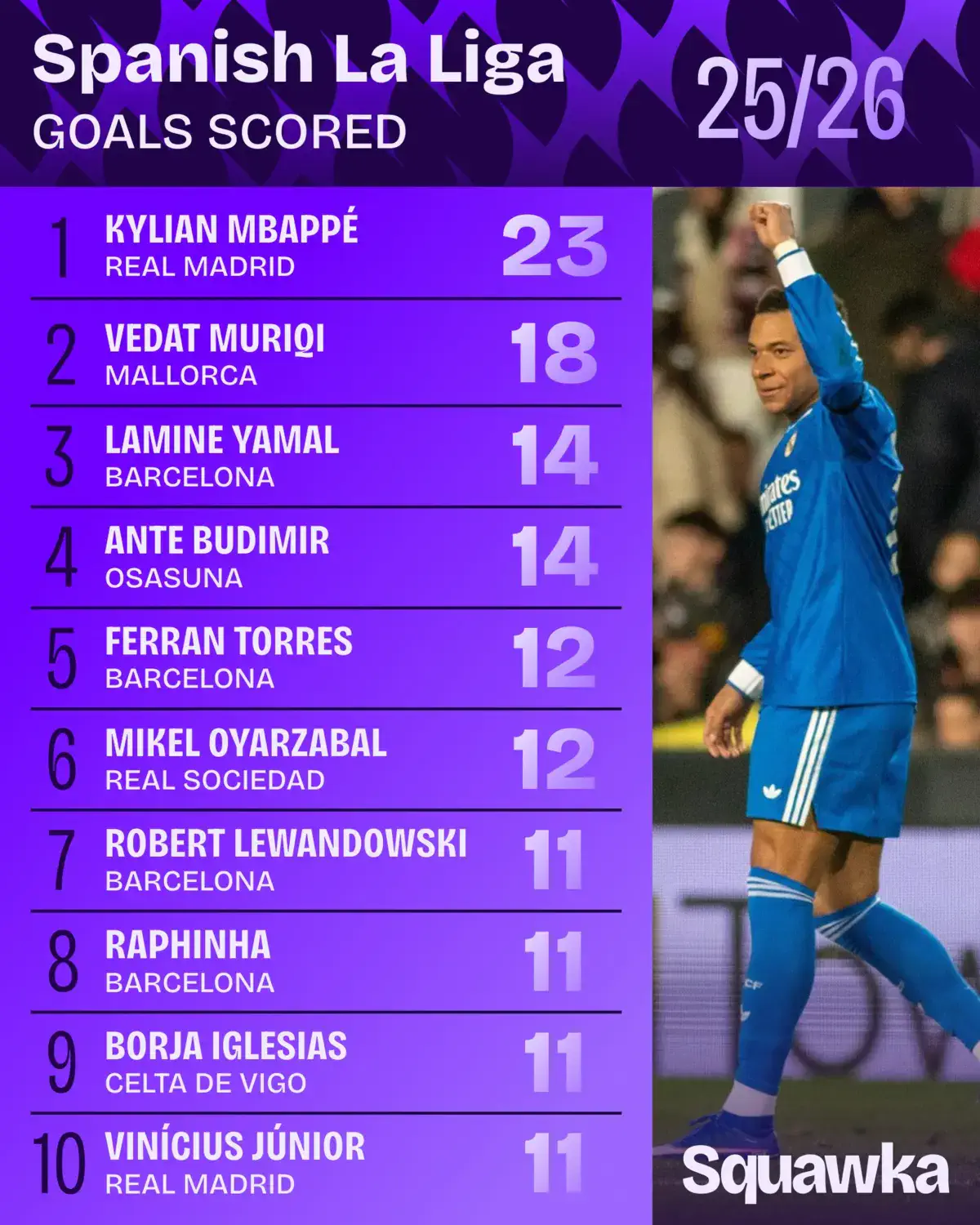 Fransiyalik yulduz ayni damda La Ligada darvozaga yo‘llangan zarbalar soni (111), aniq zarbalar (51) va urilgan gollar (23) bo‘yicha peshqadamlik qilmoqda. Shu bilan birga, Mbappe Ispaniya chempionatida 100 dan ortiq zarba, 50 dan ortiq aniq zarba va 20 tadan ko‘p gol muallifiga aylangan yagona futbolchi bo‘lib turibdi.