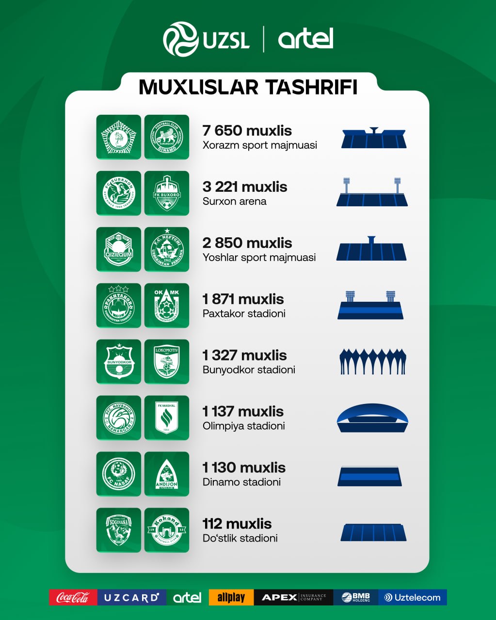 O‘zPFL Superliga 5-tur o‘yinlarini tomosha qilish uchun stadionlarga tashrif buyurgan muxlislar bo‘yicha statistika taqdim etdi.