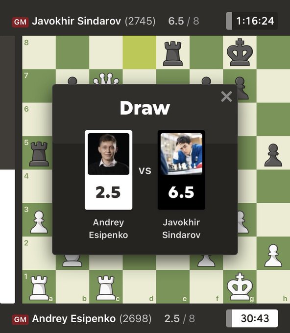 Musobaqaning ikkinchi davrasini (8-tur) boshlab bergan bahsda Sindarov FIDE bayrog‘i ostida ishtirok etayotgan rossiyalik grossmeyster Andrey Yesipenko bilan durang o‘ynadi. Tomonlar debyutda bexato harakat qilishdi. Javohir 20-yurishga kelib piyodani h4 surish orqali hujum rejasini tuza boshladi. Andrey esa hamyurtimizning hujumini qaytarish maqsadida Farzinlarni almashishni taklif qildi. Javohir almashishni istamadi, ammo yurishlar 3 marta takrorlangach, 24-yurishda shaxmatchilar durangga imzo chekishdi.