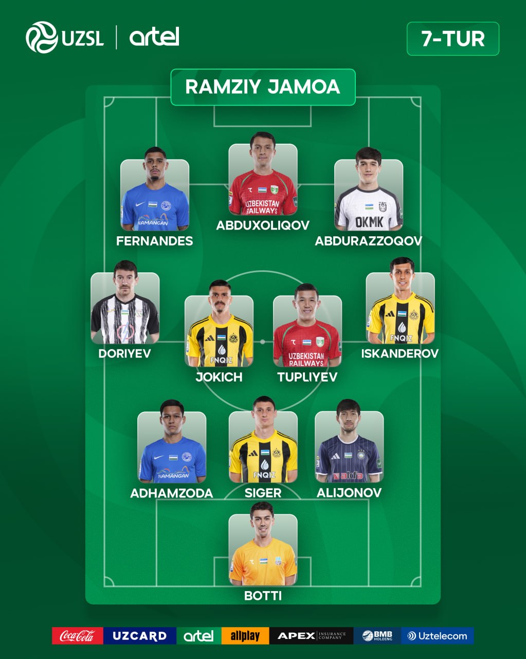 O‘zPFL rasmiy telegram-kanali Superligada 7-tur ramziy jamoasini e’lon qildi. Undan quyidagi futbolchilar o‘rin oldi.