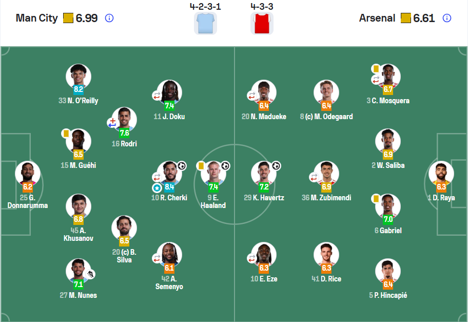 “Manchester Siti”ning birinchi goliga mualliflik qilgan Rayan Sherki o‘yinning eng yaxshi futbolchisi deb topildi — 8,4 ball. Chap qanot hujumi va himoyada faol bo‘lgan Niko O’Raylining harakatlari — 8,2 ball, “shaharliklar”ning ikkinchi golini kiritgan Erling Holand hamda chap qanot hujumchisi Jeremi Dokuning ko‘rsatgan o‘yini 7,4 ballga loyiq ko‘rilgan. Maydon markazida ishonchli harakat qilgan Rodrifa 7,9 ball berilgan.