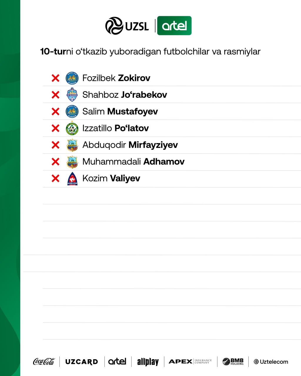 O‘zPFL ushbu turni diskvalifikasiya sabab o‘tkazib yuboradigan futbolchilar ro‘yxatini e’lon qildi.