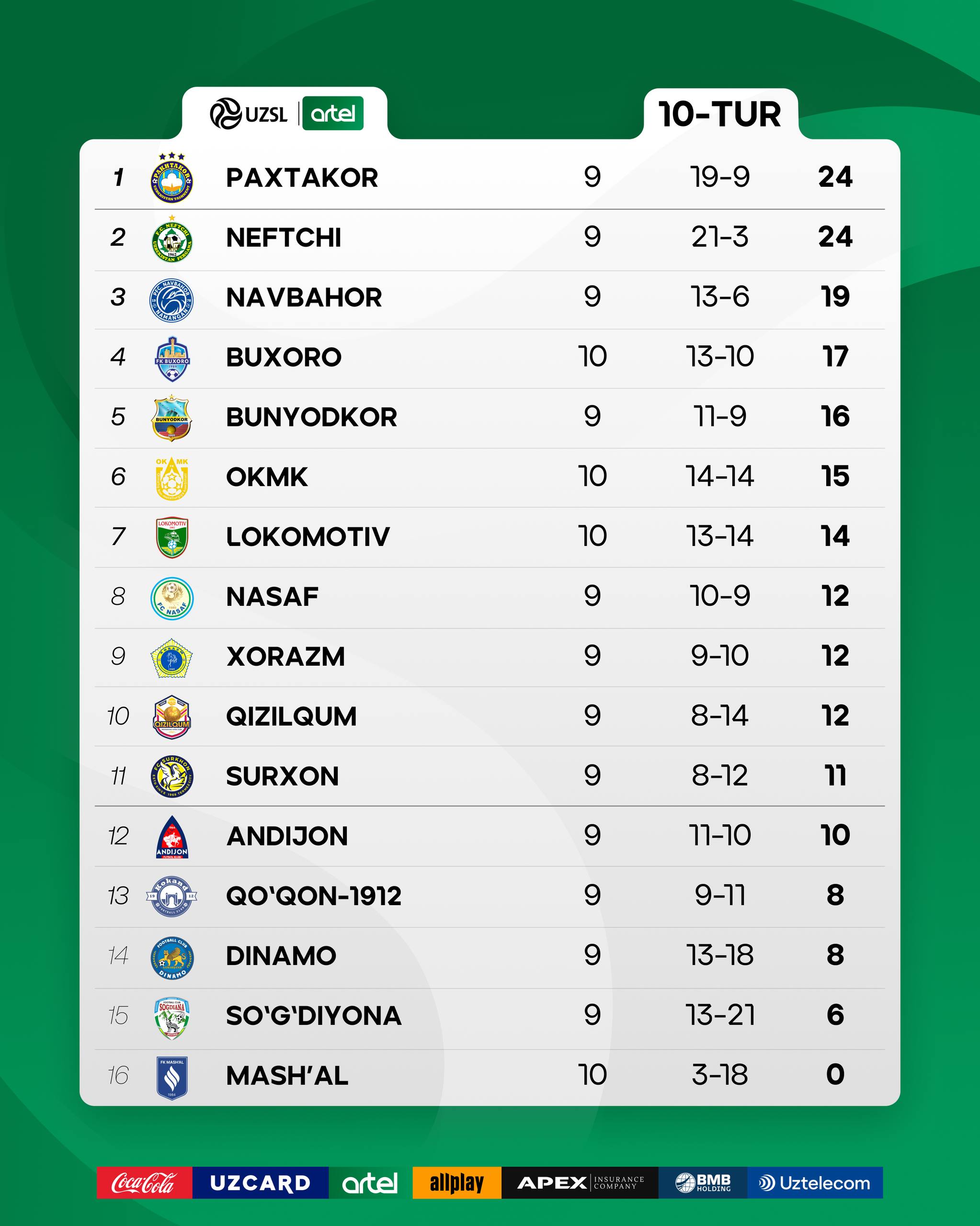 Bugungi uchrashuvlardan so‘ng turnir jadvalidagi holat bilan tanishing.