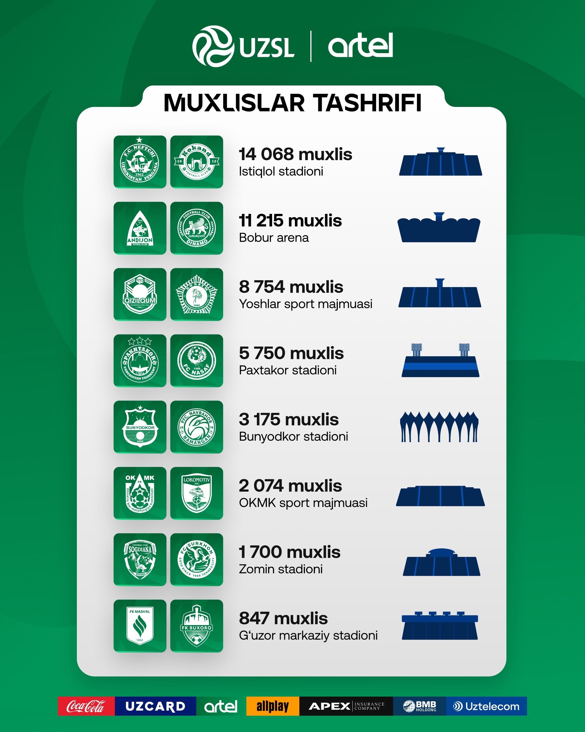 O‘zPFL Superligada 10-tur o‘yinlarini tomosha qilish uchun stadionlarga tashrif buyurgan muxlislar sonini e’lon qildi.