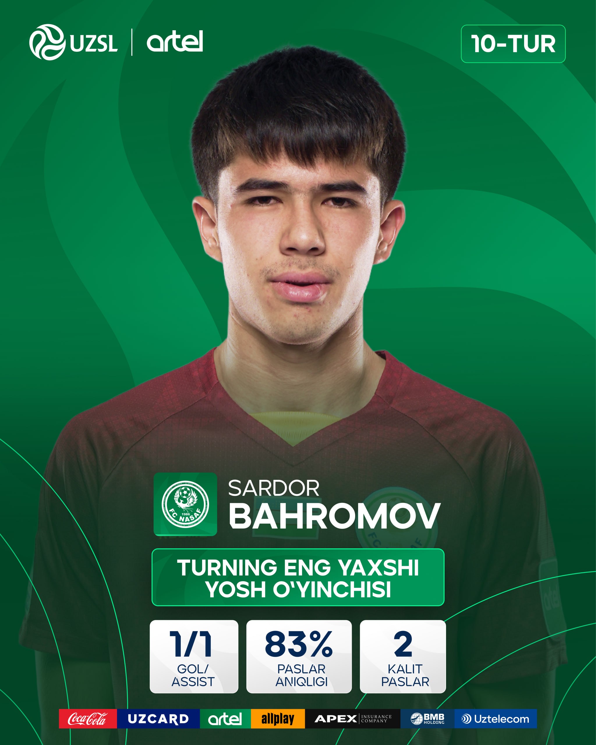"Nasaf" yarim himoyachisi Sardor Bahromov turning eng yaxshi yosh futbolchisi sifatida e’lon qilindi.